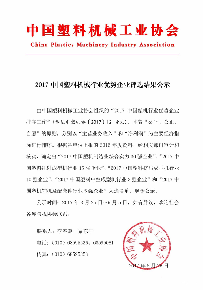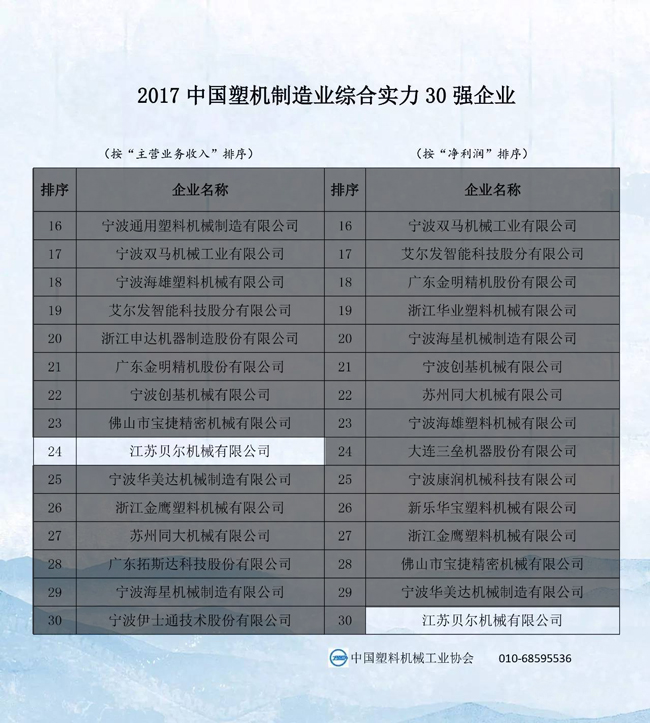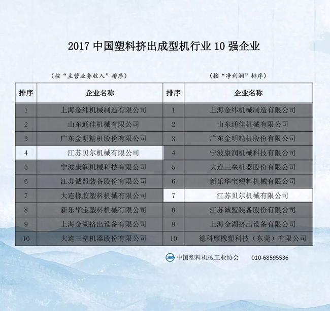 2017中國塑料機械行業(yè)優(yōu)勢企業(yè)的排名公示,江蘇貝爾機械榮獲中國擠出成型機行業(yè)前4強,塑機行業(yè)前24強榮譽稱號!